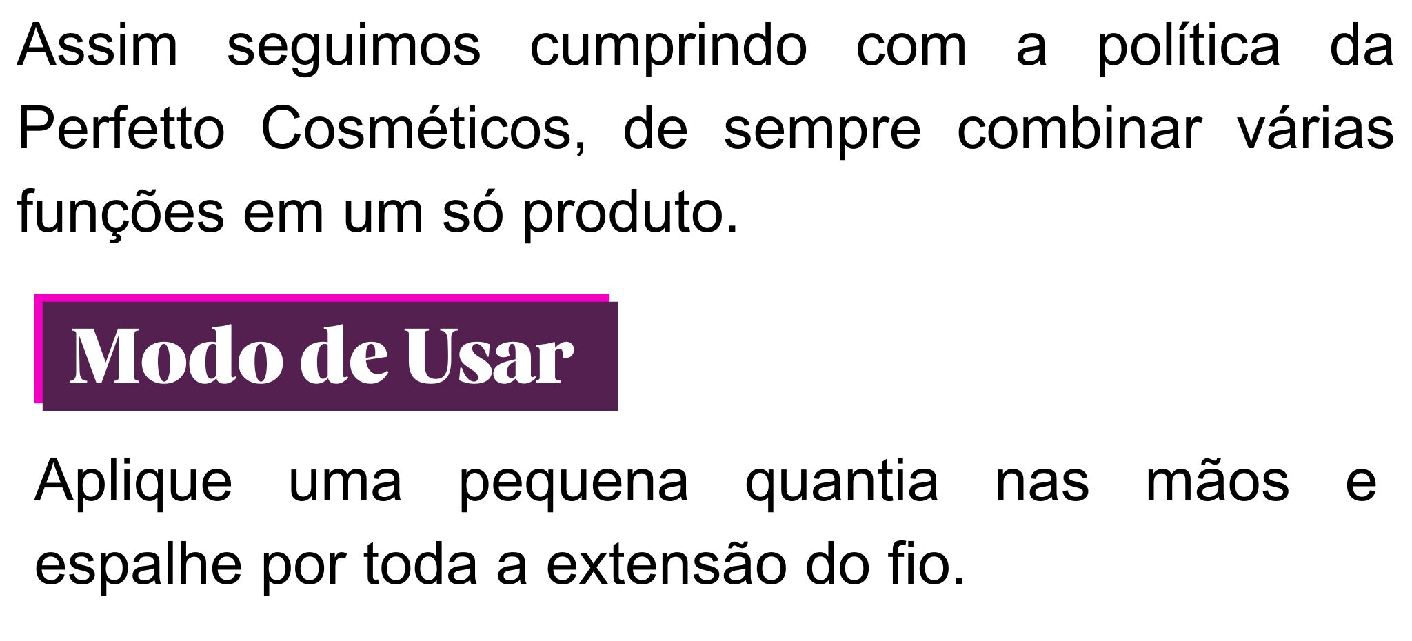 O produto tem um cheirinho ótimo, um pump sinto que é o suficiente para as pontas do cabelo, deixa os cabelos macios e sedosos.